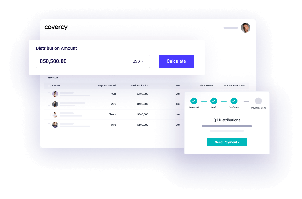 Only Covercy makes distribution payments this simple. Thanks to customizable waterfall models fully integrated with Excel, you can make one-click distributions, track and reconcile all payments down to the cent, and instantly integrate transaction data with third-party accounting systems. All from a single platform.