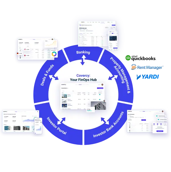 Covercy’s FinOps framework streamlines back-office processes for real estate firms by connecting bank accounts, integrating third-party property management and accounting tools, and layering it all on top of powerful investment management functionality. All in one simple platform.