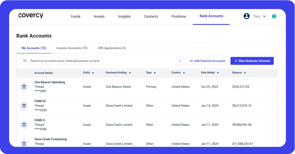 Seamlessly link external bank accounts for both incoming and outgoing transactions, ensuring smooth cash flow between the GP, property or fund and the LPs, vendors, or other recipients without logging out of Covercy’s platform.